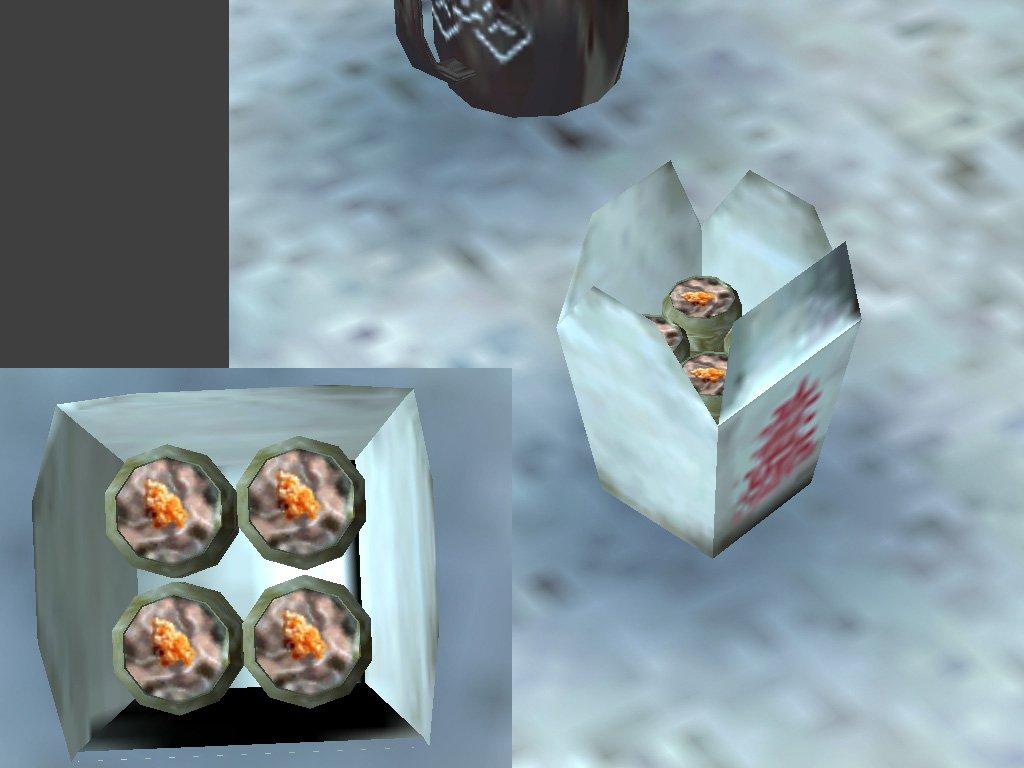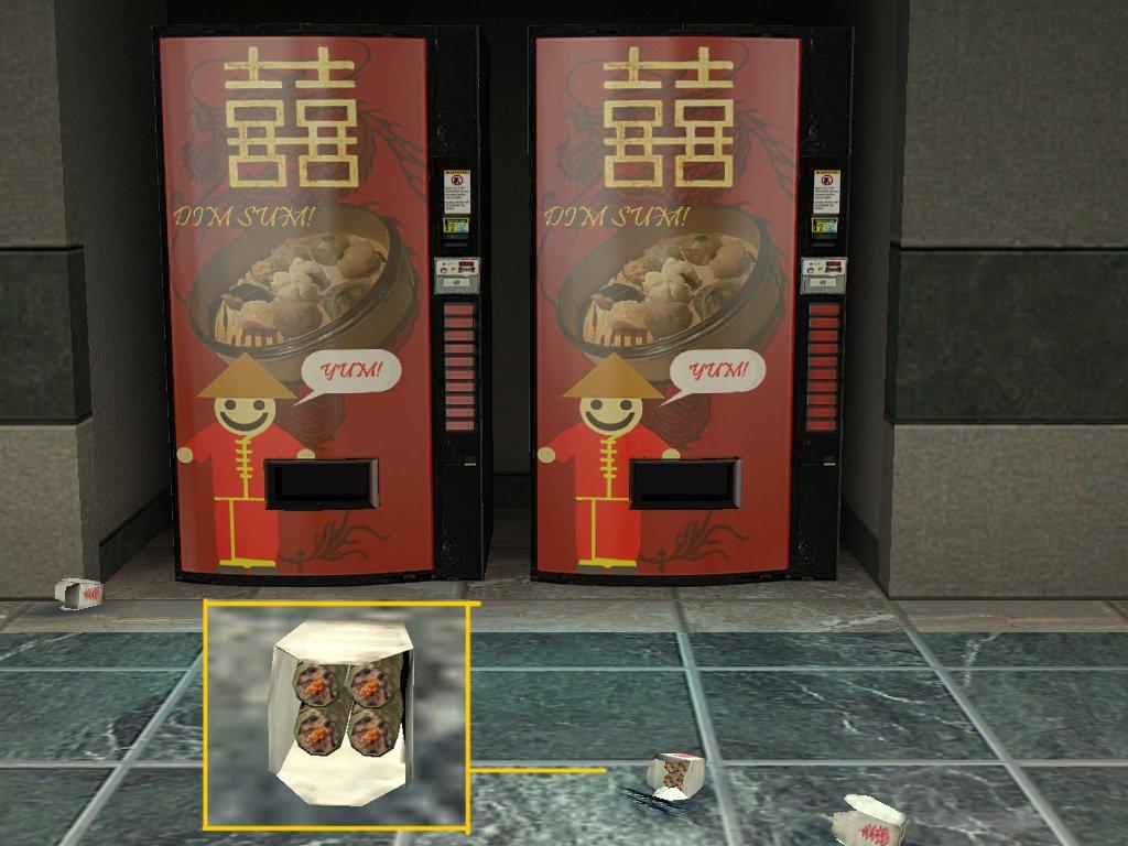 I took the valve takeout carton and soda can and transformed it to food. What more do you want? There are 2 versions, the closed box version, and the open box version. The featured dim sum is pork sui mai, and there are 8 of them in a box. So if you're ever in the middle of a firefight, and need something to eat, stop by the vending machine.