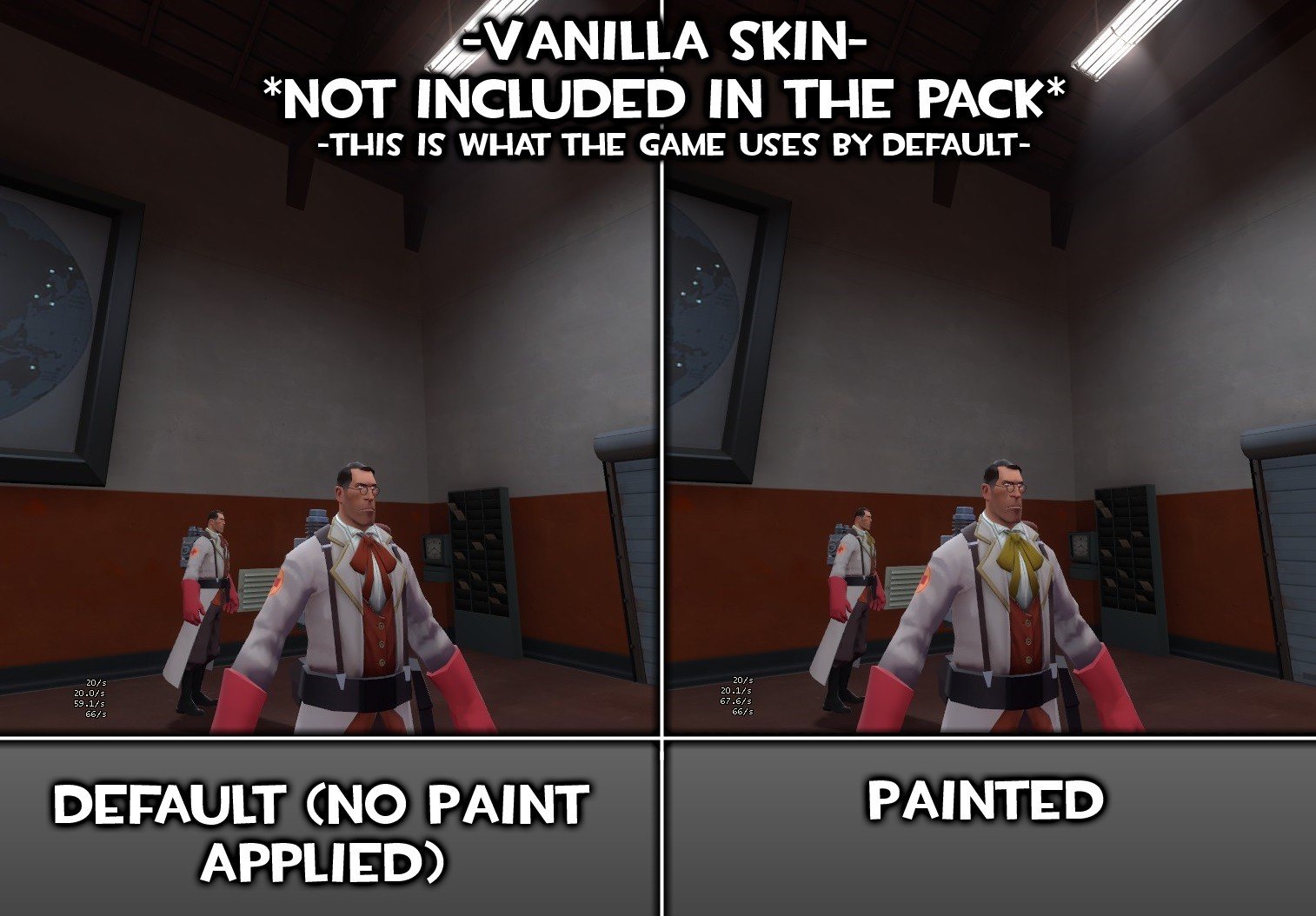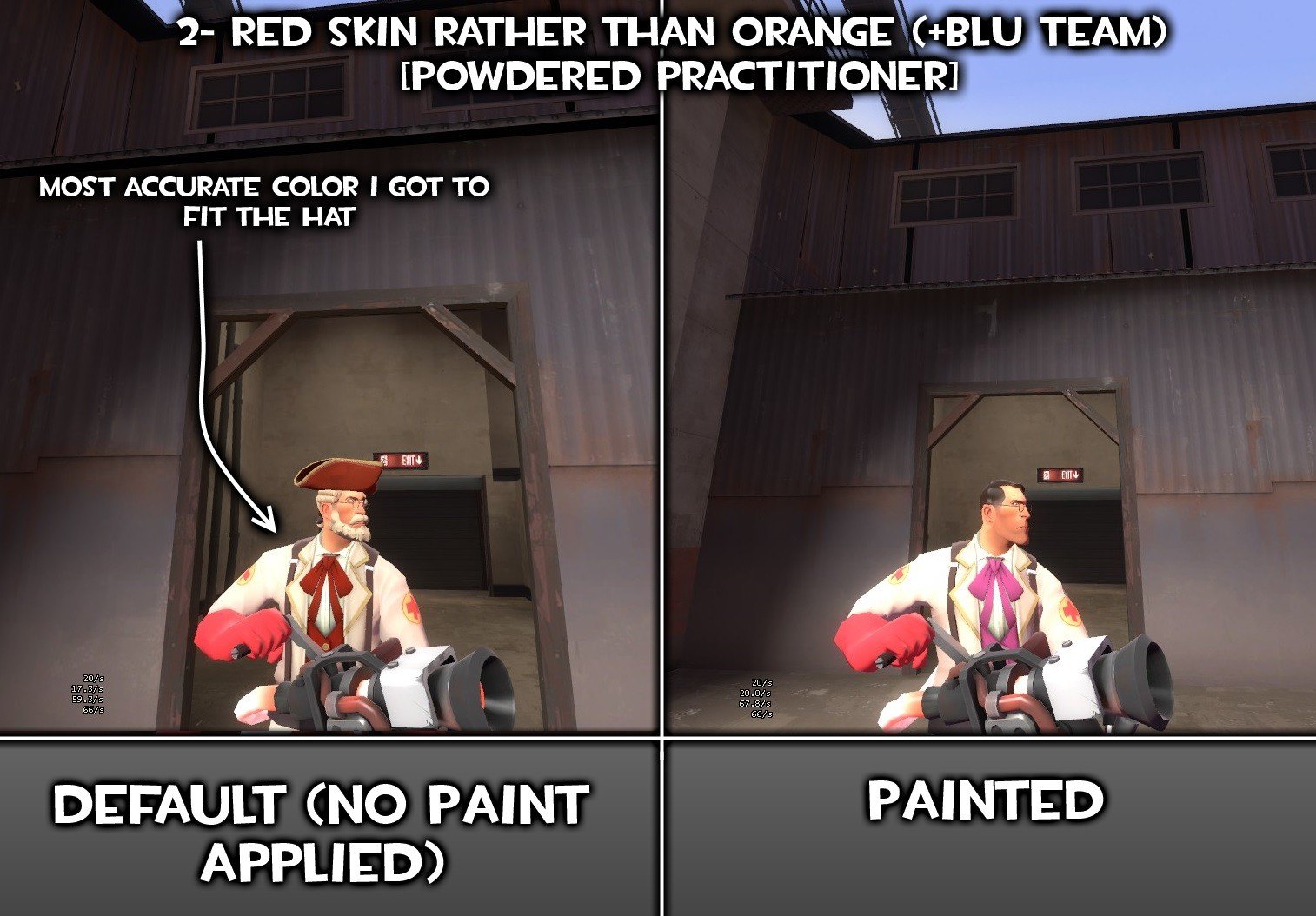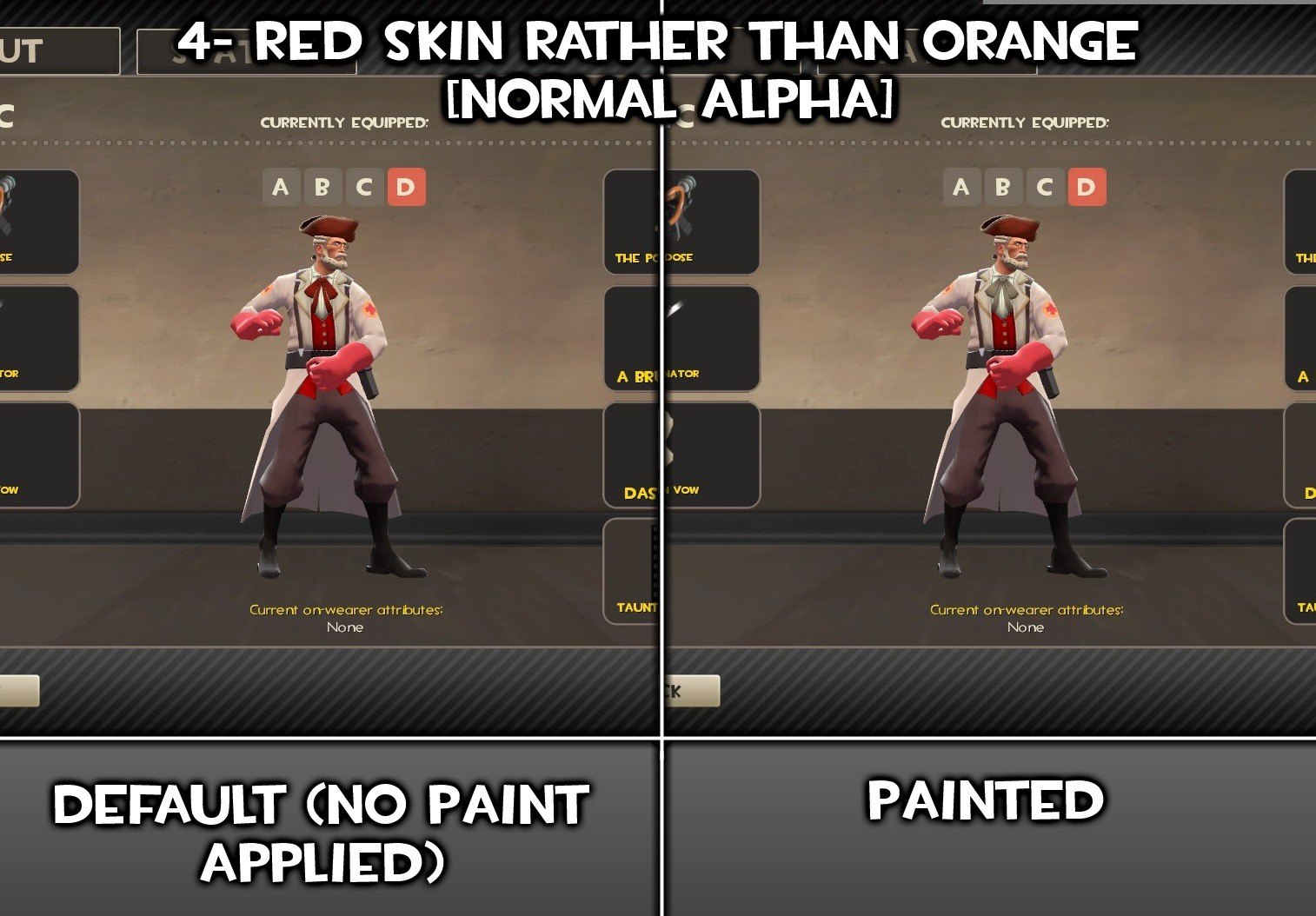 I gotta say, I love the Maxof2D work on this model, but, valve removed the alpha to not have team issues (with Slate paint). Although, it was a piece of cake to re-put the alpha mask on it, but, what did take more, was the extras. I've made skins for fit the Powdered Practitioner hat, with RED team texture, and it does also include the alpha mask full paintabillity with my GAMEBANANA: Das Fantzipantzen Red Team - Color Fix [V2] (Team Fortress 2 > Skins > Cosmetics).