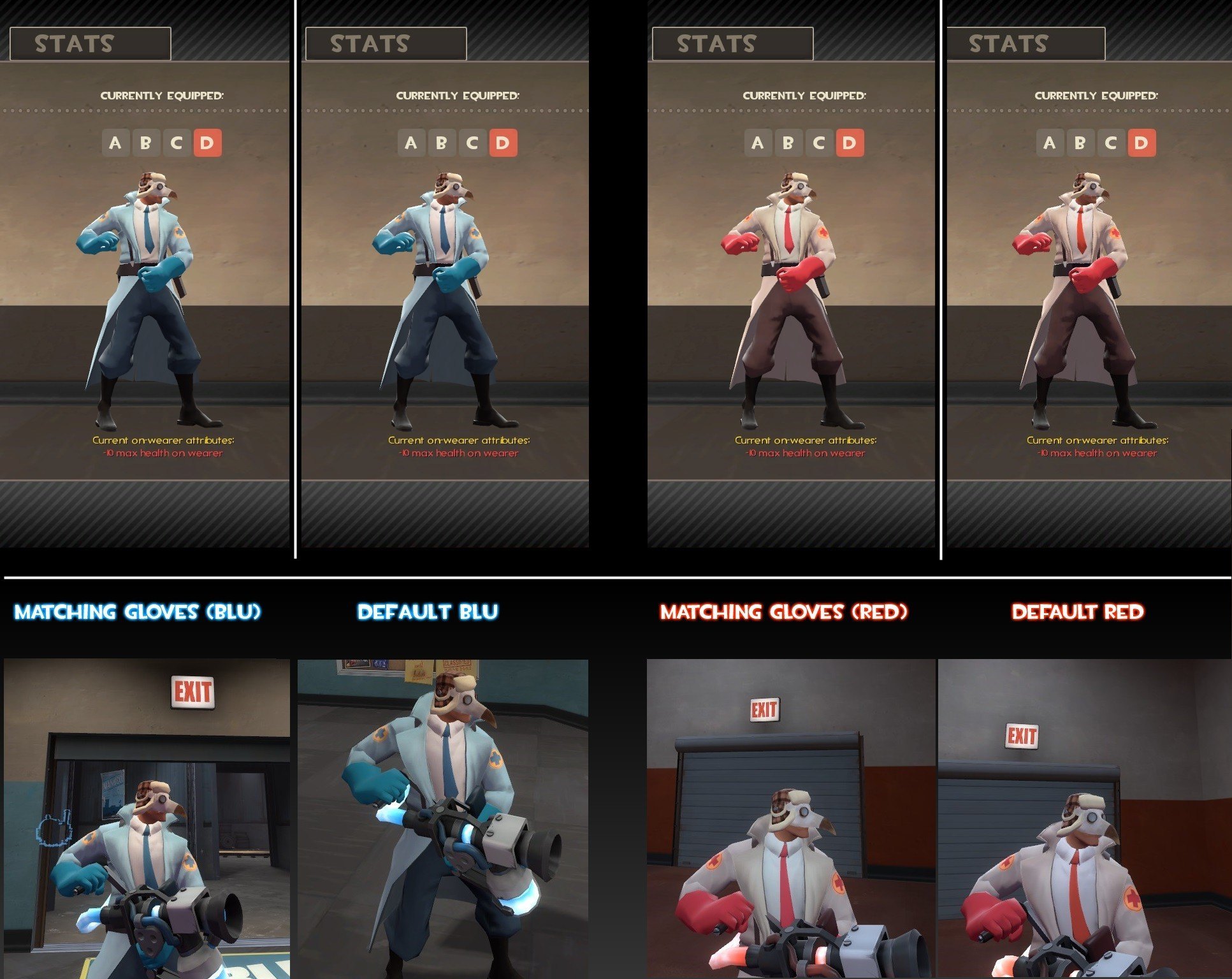 The "Medic Gloves Color (BLU only)" will edit the BLU team texture to fit more with his gloves.