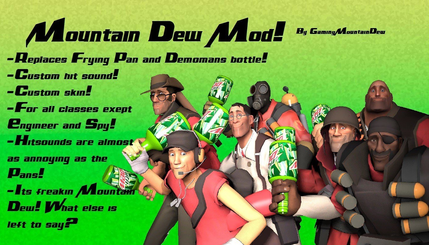 Ever wanted to kill somebody with a bottle of Mountain Dew but was warned by the police not to? Well the time is now in which your sick dreams will finally see the light of day! This Mountain Dew mod replaces the Frying Pan AND it's hitsound. Watch the demonstration video to see what will be replaced.