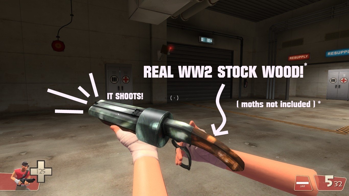 | Добавил: The DSystem 2016-04-10 06:42:37 81 просмотр I was thinkin' oh, i like old, battle-scarred stuff. So i picked up the scattergun's vtf and started adding this sorta "ERODED IRON" effect which i found pretty rad. I made a dustier and a darker version too.