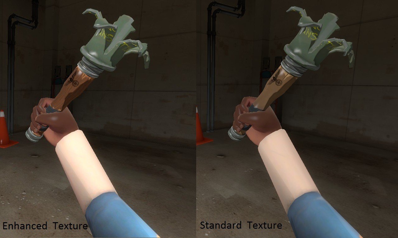 Поставляется с 2 различных версиях, расширенной текстуры древесины или стандартный стиль, incase вы действительно хотите сохранить этот стиль TF2.